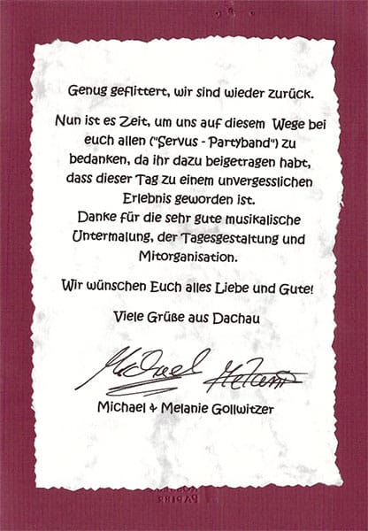 wir möchten uns recht herzlich für eure tolle Unterhaltung bedanken. Ihr habt toll gespielt und gesungen. Die Hochzeitsgäste waren begeistert von euch – wir auch ���.