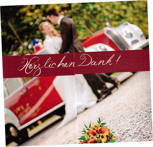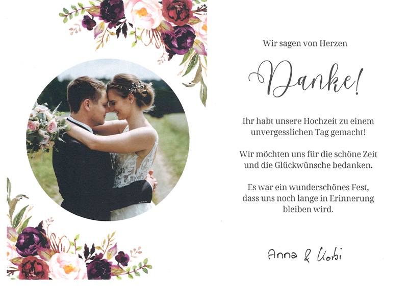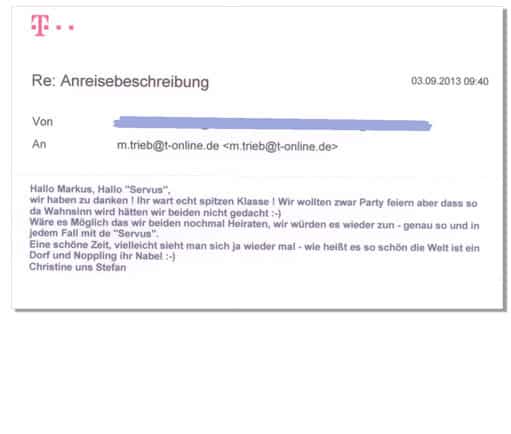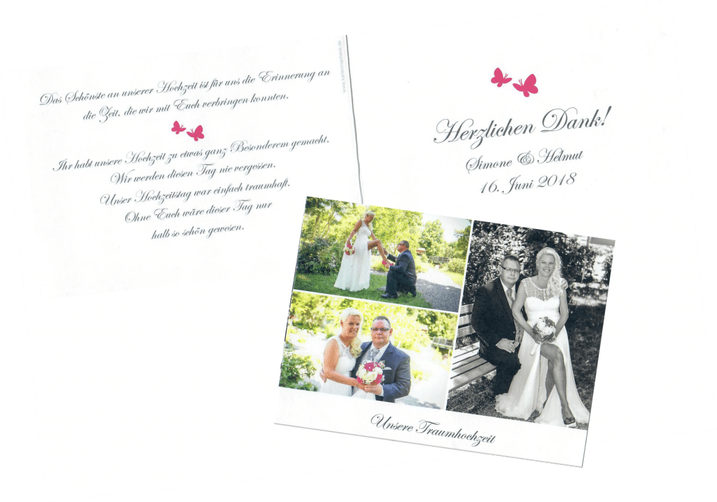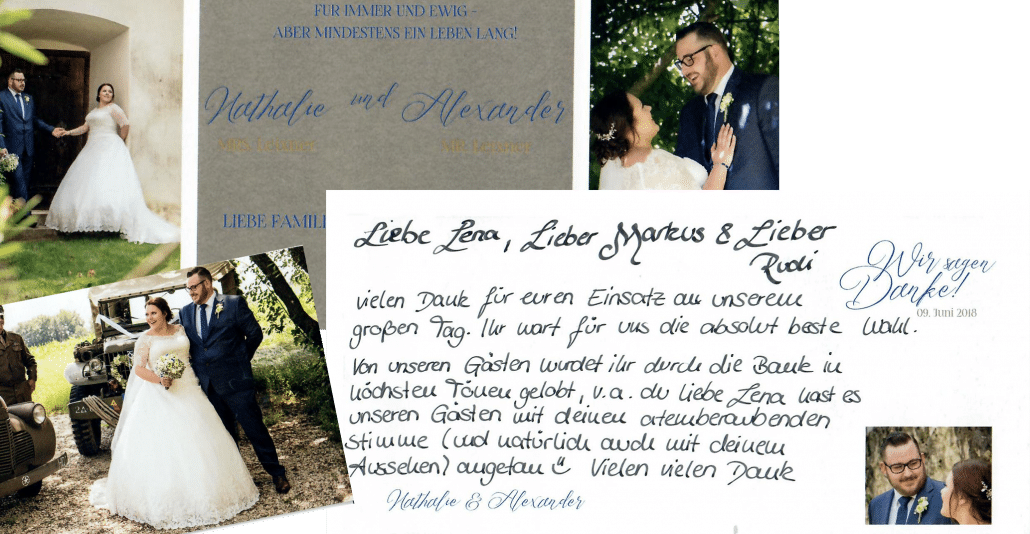 Hallo Markus, sorry dass ich mich erst jetzt melde. Auch für uns war es dank euch, ein wunderschöner Tag. Danke für alles. Nun hast du auch meine neue E-Mail Adresse.
